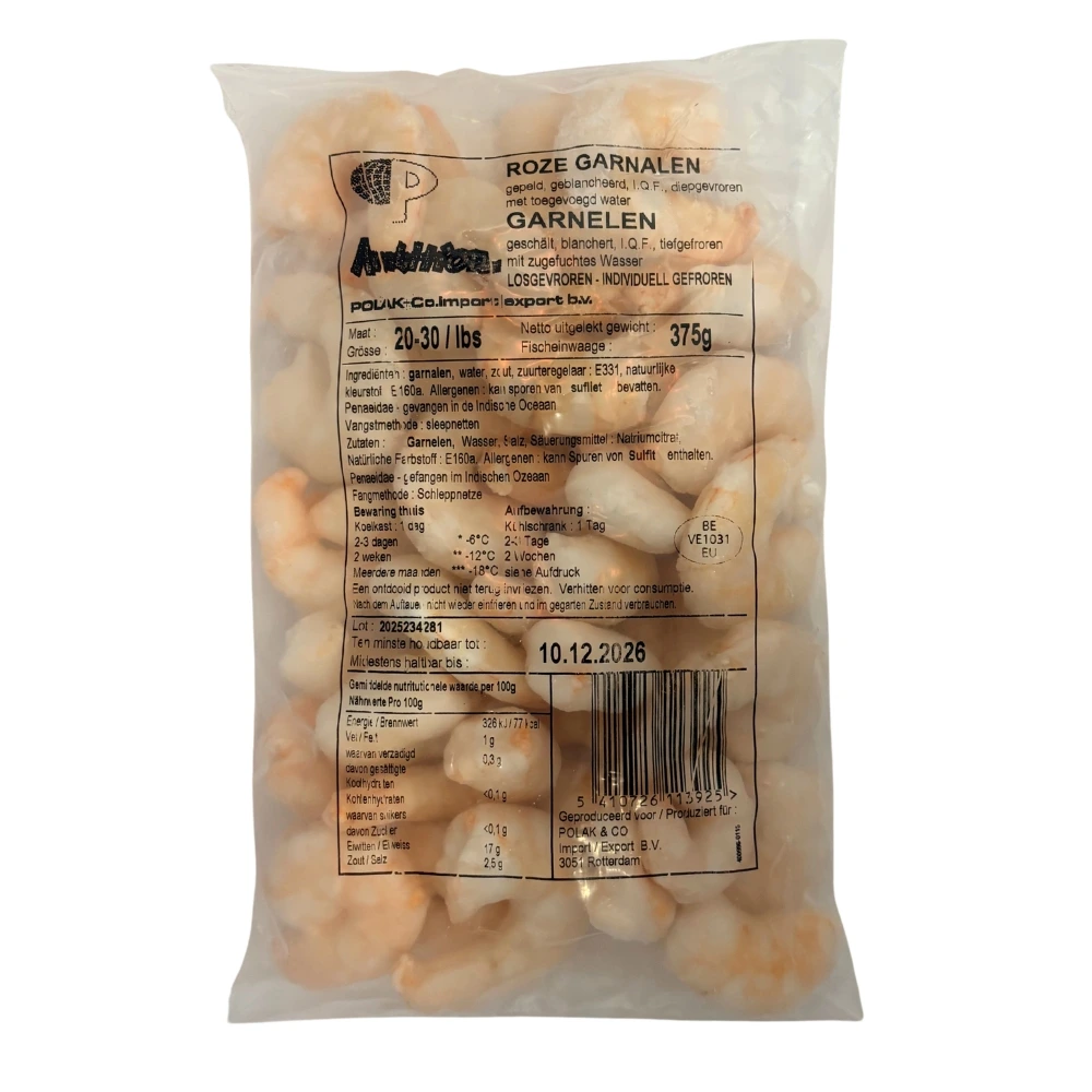 Gepelde rauwe garnalen (PUD) Blanched Roze 20/30 Bestellen Artikelnummer: 101492 Categorieën: Diepvries, Vis en garnalen Beschrijving Beschrijving Verpakking: Krts 24/500 g zakken Product code: 101492 Gerelateerde producten Gepelde gekookte garnalen (PUD) 100/200 Lees verder Gepelde rauwe garnalen (P&D) Vannamei 26/30 Lees verder Partygarnalen, gepeld, gekookt, met staart (CPTO) 31/40 Lees verder Garnalen zonder kop (HLSO) Black tiger 13/15 Rauw Lees verder